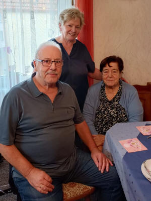 Hochzeit. ![]() Ortsvorsteher Horst Zentner überbrachte die Glückwünsche der Gemeinde Durbach, verbunden mit dem herzlichen Dank für ihr außergewöhnliches ehrenamtliches Engagement für die Dorfgemeinschaft. Die Hochzeit fand vor 60 Jahren in Windschläg statt, weil die Pfarrkirche in Ebersweier umgebaut wurde. Anschließend wurde groß, mit einer öffentlichen Hochzeit, im Gasthaus "Zur Krone" gefeiert. Der Hochzeitstag war auch der Einzugstag des jungen Paares in das neue Haus in der Schulstraße, in dem die Beiden noch heute glücklich wohnen. |