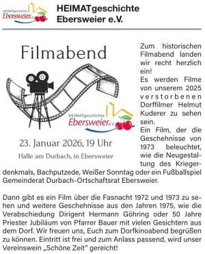 Bilder - Menschen - Ebersweier 2025 "Rathausplatz und mehr..." Der Jahresrückblick von Ortsvorsteher Horst Zentner auf das Jahr 2025 in vielen Bildern. ![]() Wir lassen das vergangene Jahr noch einmal in Bildern Revue passieren und erinnern uns an viele schöne, fröhliche und emotionale Momente 2025. Den Jahresrückblick Ebersweier können sie HIER downloaden und anschauen. Zum Jahresrückblick der Gemeinde Durbach geht es hier entlang! |