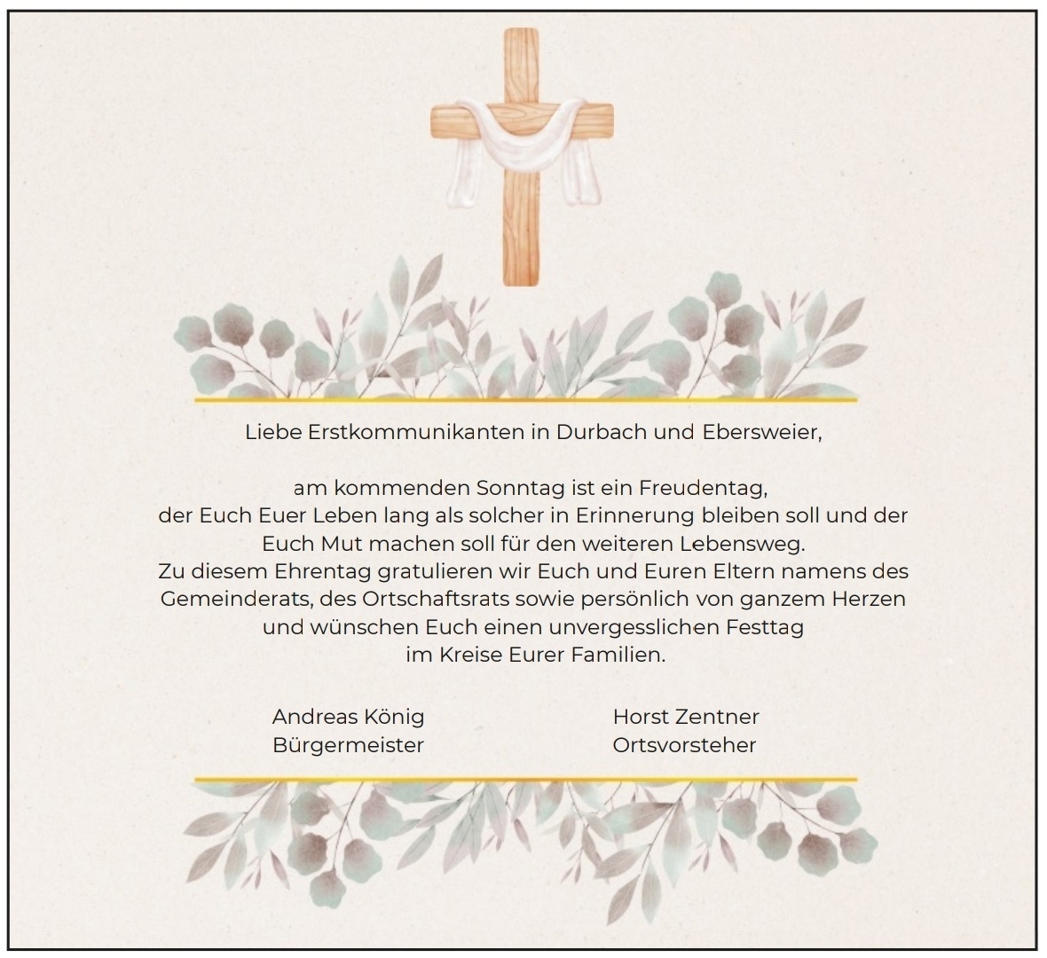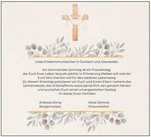![]() Bleiben Sie auf dem Laufenden und erhalten Sie hier aktuelle Infos aus dem Rathaus und aus Ebersweier ---------------------------------------- Ebersweier & Durbach feiert Kommunion am Weißen Sonntag, 12. April 2026 ![]() Aus dem Gebet eines Kindes: "Hallo Jesus, heute ist ein wunderbarer Tag. Ich gehe zur ersten heiligen Kommunion. Ich freue mich sehr, dass ich dein Freund sein darf. Du stärkst mich mit dem Brot, das du selbst bist. Lass mich noch lange an diesen Tag zurückdenken. Danke. Amen. |