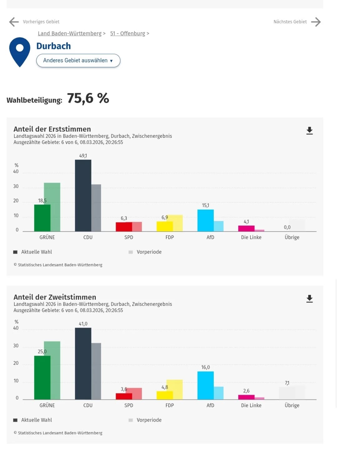 ![]() Bleiben Sie auf dem Laufenden und erhalten Sie hier aktuelle Infos aus dem Rathaus und aus Ebersweier ---------------------------------------- Ergebnisse und Übersichten aus Durbach zur Landtagswahl in Baden-Württemberg am 8. März 2026... ![]() ...weitere Charts und Tabellen finden sie ganz unten auf dieser Seite und auf der Homepage der Gemeinde Durbach Hier gehts zum Ergebnis |
