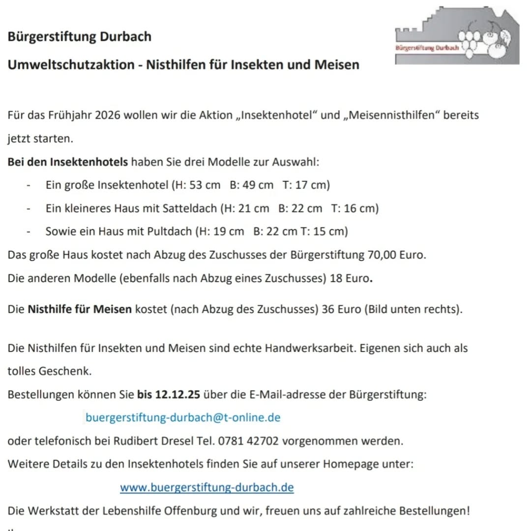 ![]() Bleiben Sie auf dem Laufenden und erhalten Sie hier aktuelle Infos aus dem Rathaus und aus Ebersweier ---------------------------------------- Umweltschutzaktion der Bürgerstiftung Durbach Nistenhilfen für Insekten und Meisen ![]() ----------------------------------- Kürbisskunst in Ebersweier ![]() |