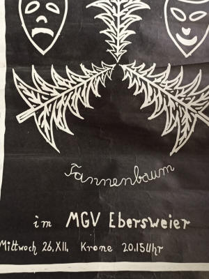 Laienspielgruppen und Theater am Stephanstag in Ebersweier Eine über Jahrzehnte gepflegte Tradition in Ebersweier waren die Theateraufführungen der Laienspielgruppen am 2. Weihnachtstag. Ursprünglich im großen Nebenzimmer, mit Bühne, im Gasthaus "Zur Krone", später sogar in der neu gebauten Halle am Durbach wurden zahllose, lustige Stücke einstudiert und dem Publikum dargeboten. Wochenlang wurde geprobt, Bühnenbilder gebaut und gemalt, Texte gelernt und Dialoge perfektioniert. Kaum ein Ebersweierer, der nicht als Darsteller oder Zuschauer diesen besonderen Abenden beigewohnt und entgegengefiebert hat. Bis es dann endlich wieder vom Sprecher und Ansager hieß: "Vorhang auf und Bühne frei für ein Lustspiel in drei Akten". Über die Jahre wurden die Theaterabende unter der Regie der Feuerwehr, des Männergesangsvereins und der Feuerhexen durchgeführt und veranstaltet. |