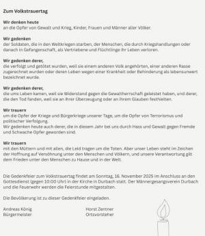![]() Bleiben Sie auf dem Laufenden und erhalten Sie hier aktuelle Infos aus dem Rathaus und aus Ebersweier ---------------------------------------- Zum Volkstrauertag von Bürgermeister Andreas König und Ortsvorsteher Horst Zentner ![]() Die Gedenkfeier zum Volkstrauertag findet am Sonntag, 16. November, zirka 10 Uhr, nach dem Gottesdienst in der Pfarrkirche St. Heinrich in Durbach statt. Der Männergesangsverein Durbach und die Feuerwehr Durbach werden die Feierstunde mitgestalten. Die Bevölkerung ist dazu herzlich eingeladen. |