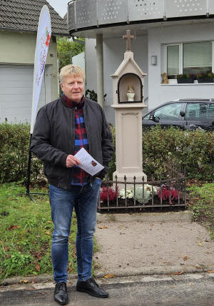 ![]() Mitglieder und Freunde der HEIMATgeschichte Ebersweier feierten die Sanierung des Bildstöckles am Stöckweg. Dorfsteinmetz Armin Heitz hat sich dem aus dem Jahr 1872 stammende Kleindenkmal wieder neuen Glanz verschafft. Pastoralreferent Stephan Thüsing begleitete ebenfalls die Feier und segnete das Denkmal und die rund 20 Teilnehmer. Die Bürgerstiftung Durbach hat das Projekt in ihr Förderprogramm aufgenommen und 300 Euro für die Restaurierung zugesichert. |