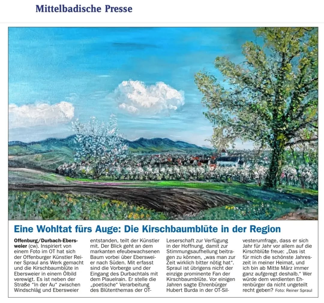 Ebersweier in Öl von Künstler Reiner Spraul aus Offenburg "Die Kirschbaumblüte" zeigt Ebersweier mit Blick Richung Süden von In der Au und war im Offenburger Tageblatt, der Mittelbadischen Presse, abgedruck. ![]() |