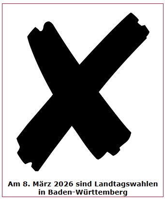 Am 8. März 2026 sind Landtagswahlen in Baden-Württemberg ![]() Die amtliche Wahlbenachrichtung solltet ihr bald in eurem Briefkasten finden. Mit dieser Benachrichtung könnt ihr auch die Briefwahlunterlagen beantragen. Link zum Wahlscheinantrag WÄHLEN GEHEN - MITBESTIMMEN! |