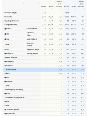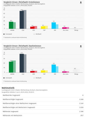 ![]() Bleiben Sie auf dem Laufenden und erhalten Sie hier aktuelle Infos aus dem Rathaus und aus Ebersweier ---------------------------------------- Ergebnisse und Übersichten aus Durbach zur Landtagswahl in Baden-Württemberg am 8. März 2026... ![]() ...weitere Charts und Tabellen finden sie ganz unten auf dieser Seite und auf der Homepage der Gemeinde Durbach Hier gehts zum Ergebnis |
