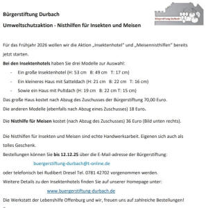 ![]() Bleiben Sie auf dem Laufenden und erhalten Sie hier aktuelle Infos aus dem Rathaus und aus Ebersweier ---------------------------------------- Umweltschutzaktion der Bürgerstiftung Durbach Nistenhilfen für Insekten und Meisen ![]() ----------------------------------- Kürbisskunst in Ebersweier ![]() |