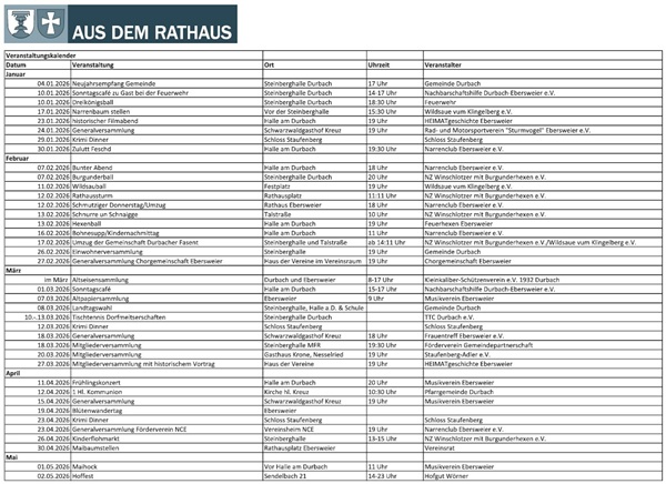 Der Veranstaltungskalender 2026 für Ebersweier und Durbach (Stand: Dezember 2025) ![]() |
