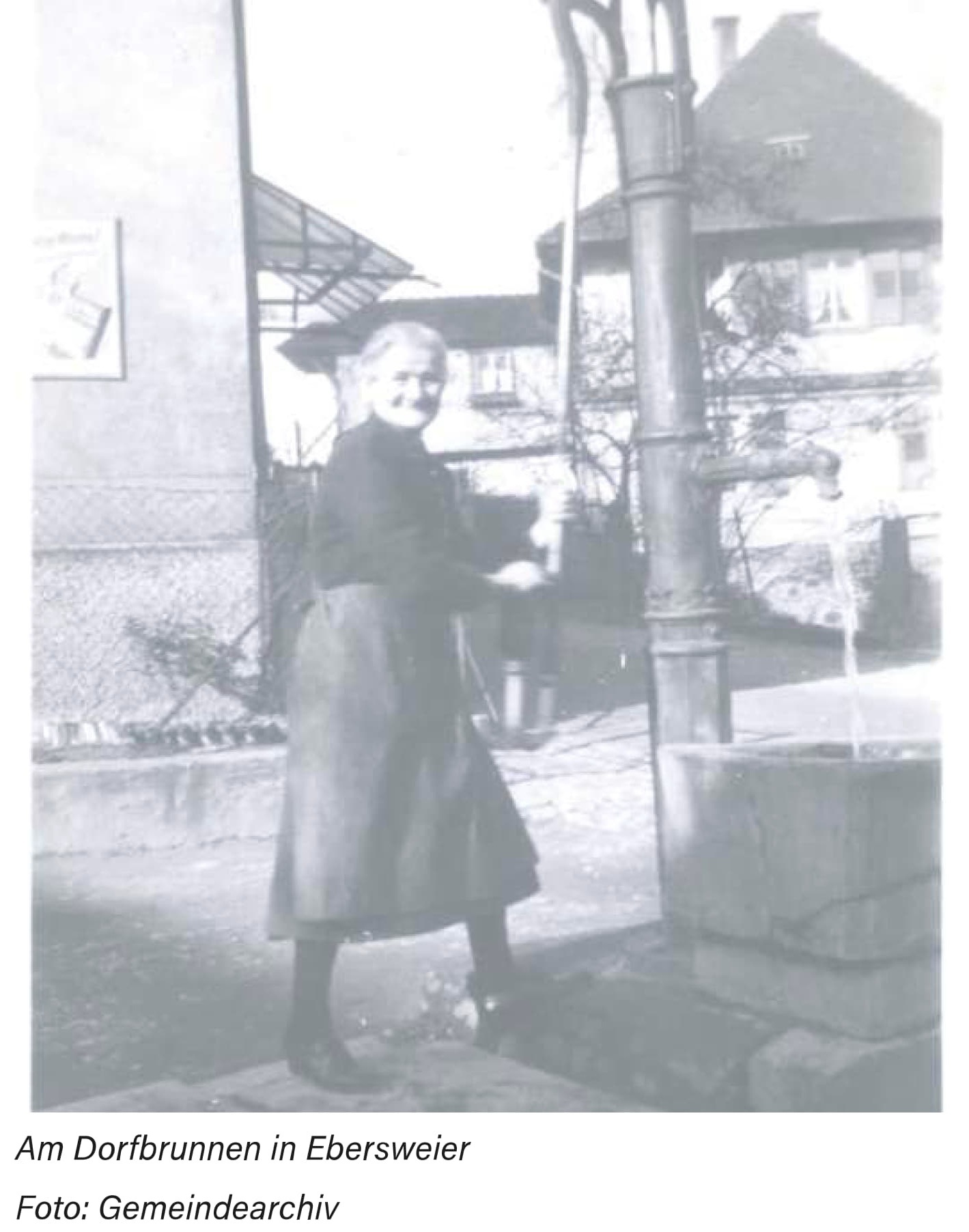 Der Schulhofbrunnen im Jahr 1907 Der Schulhofbrunnen im ehemaligen Schulhof von Ebersweier zwischen dem Rathaus und dem heutigen Haus der Vereine. Die Aufnahme datiert auf den 2. August 1907. Heute kann man noch den Standort des Brunnens auf dem Rathausplatz an seiner geringfügigen Absenkung im Plattenbelag erkennen. |