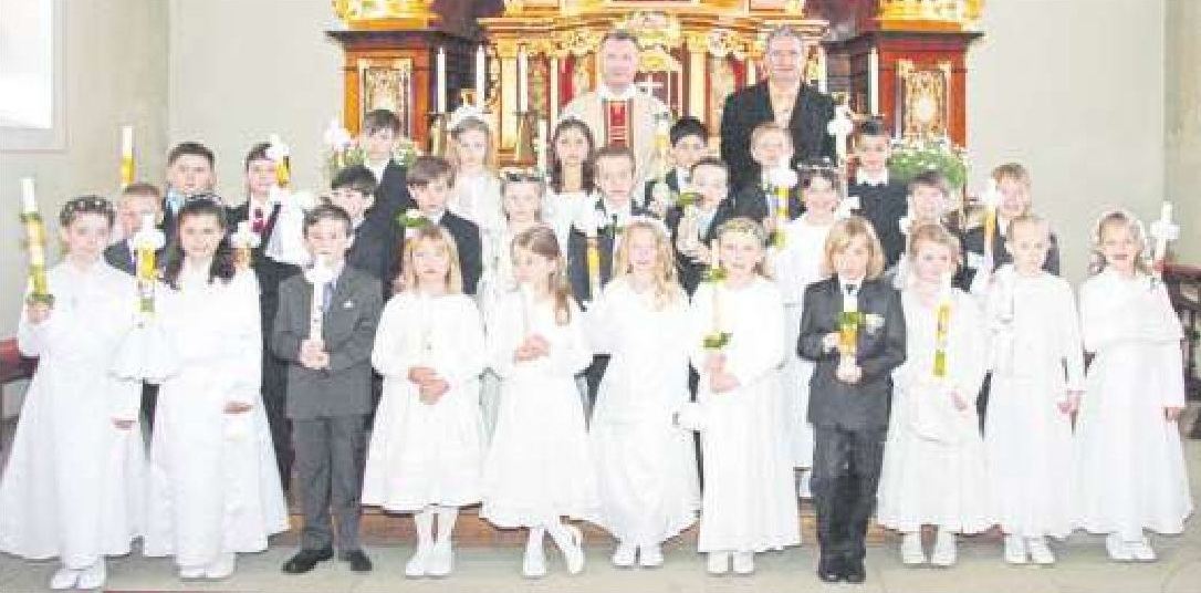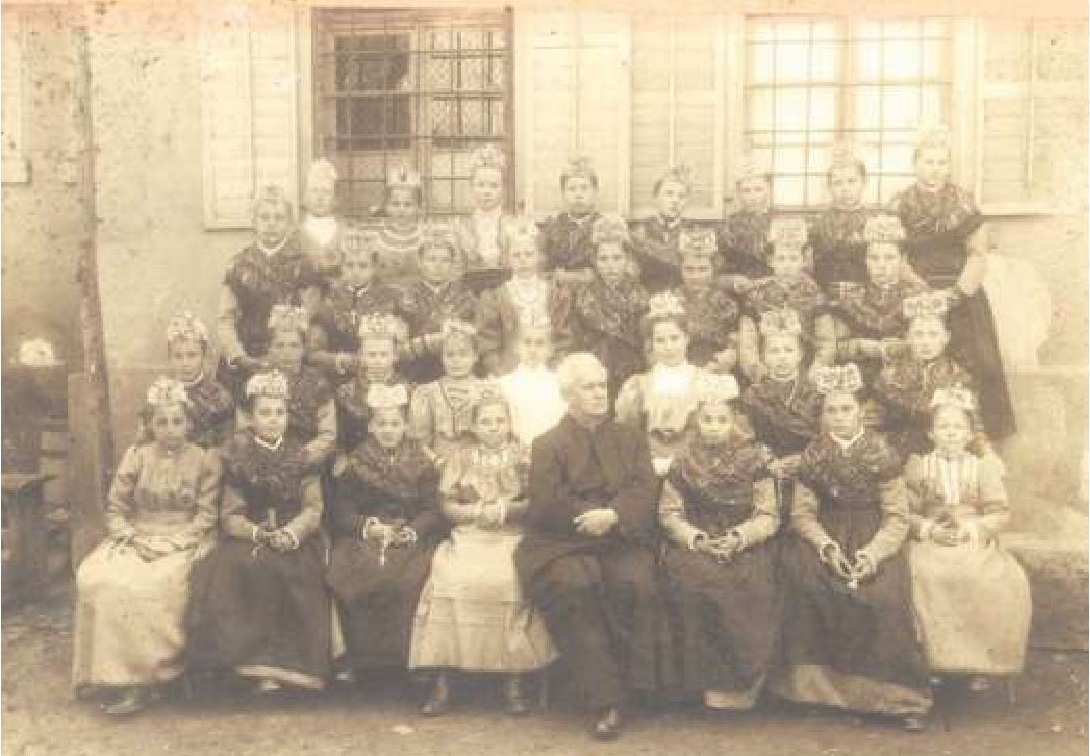 ![]() Weißer Sonntag in Ebersweier Im Jahr 2012 (oben) mit Pfarrer Dietmar Mathe in Heilig Kreuz und um 1900 (rechts) die Kommunionsmädchen mit Pfarrer Theodor Ries. |