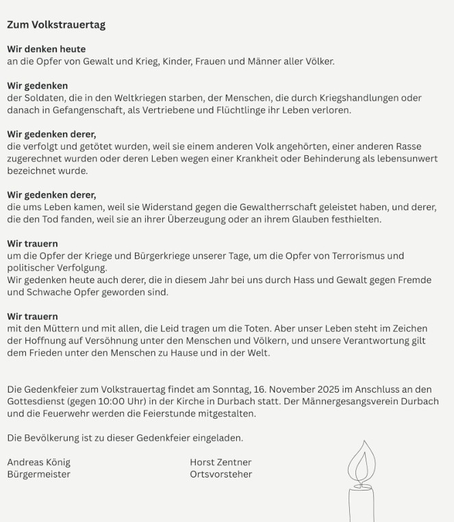 ![]() Bleiben Sie auf dem Laufenden und erhalten Sie hier aktuelle Infos aus dem Rathaus und aus Ebersweier ---------------------------------------- Zum Volkstrauertag von Bürgermeister Andreas König und Ortsvorsteher Horst Zentner ![]() Die Gedenkfeier zum Volkstrauertag findet am Sonntag, 16. November, zirka 10 Uhr, nach dem Gottesdienst in der Pfarrkirche St. Heinrich in Durbach statt. Der Männergesangsverein Durbach und die Feuerwehr Durbach werden die Feierstunde mitgestalten. Die Bevölkerung ist dazu herzlich eingeladen. |